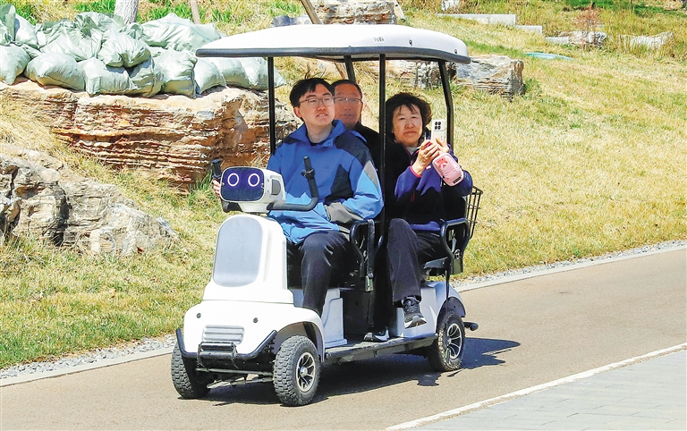 游客乘坐白小默智能导服机器人游览公园,感受科技带来的便利。