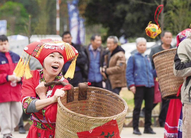 3月31日,在广西融水苗族自治县三防镇乃文村,村民参加抛绣球比赛。 当日是农历三月初三,广西多地举行多彩活动庆祝“三月三”传统佳节。 新华社发(龙涛 摄)