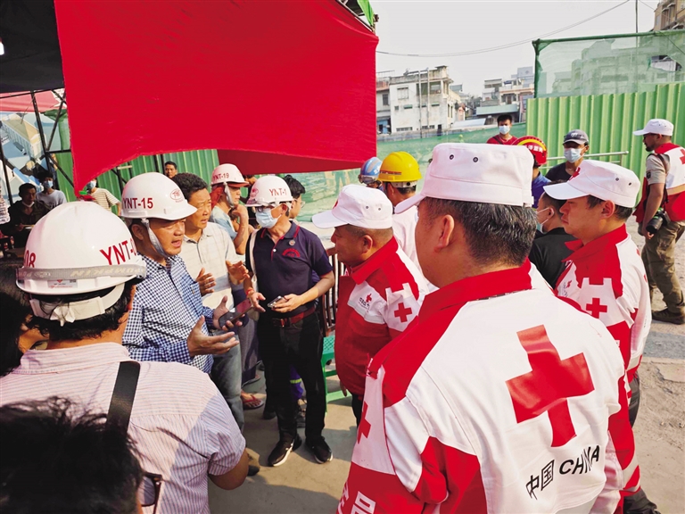 3月31日,中国红十字国际救援队成员在缅甸曼德勒开展工作。 新华社发(中国红十字国际救援队供图)