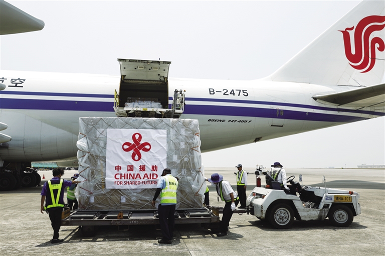 当地时间3月31日,中国政府首批援助物资抵达缅甸仰光国际机场。 新华社发(亨曼 摄)