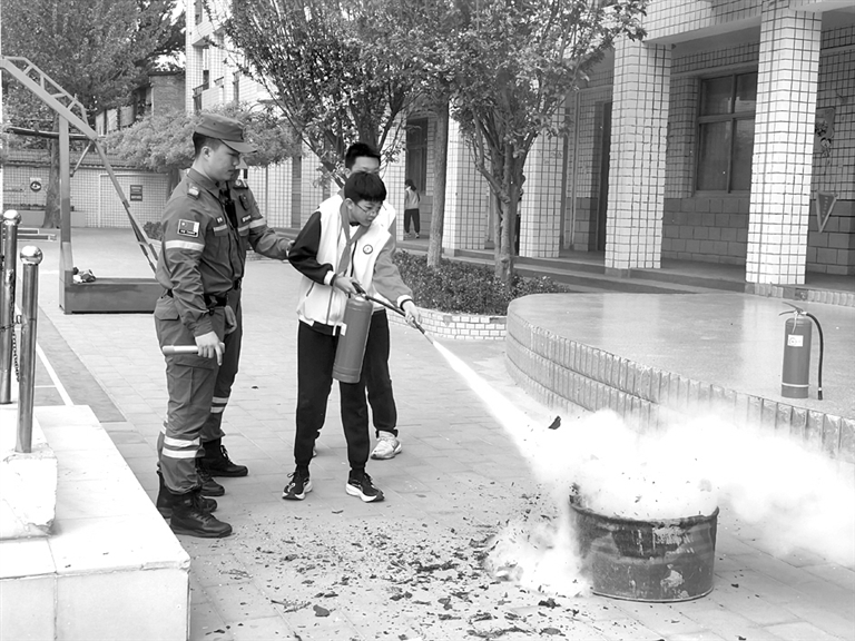 ▲学生体验干粉灭火。