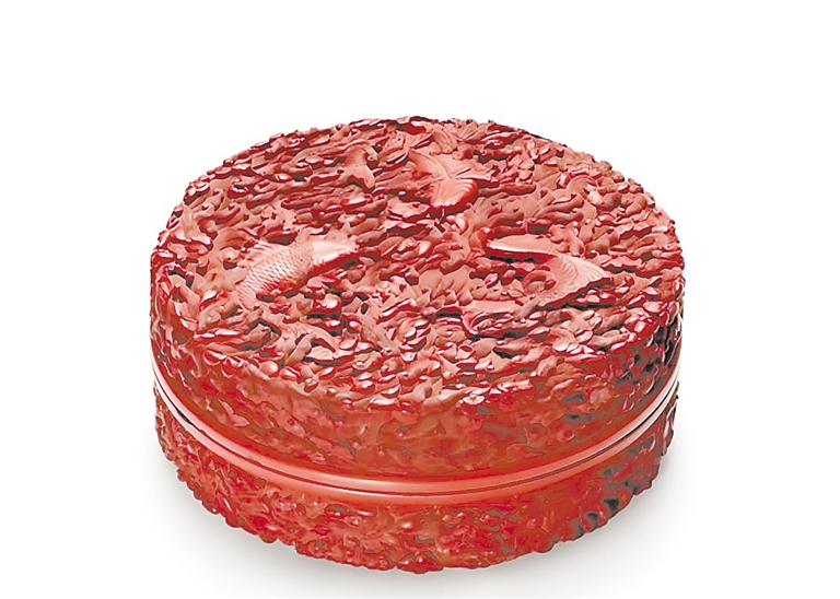 清乾隆剔红桃花流水鲤鱼盖盒。