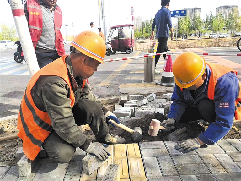 高效施工,三小时便道换新颜。4月8日,在瑞祥大街北堤路交口的便道修复任务中,市政维护中心施工团队从上午7时至10时,仅用三小时便实现“零延时”开工与“工完场净”目标。此次施工采用“三员协同”高效模式:一人主铺砖,确保砖块铺设平整对齐;一人辅助调整缝隙并压实砖块;一人专职搬砖运料,保障材料供应不间断。三人分工明确,配合默契无间,凭借专业化、标准化的作业流程,极大地提高了施工效率,充分彰显出市政队伍面对紧急任务时的快速响应能力。