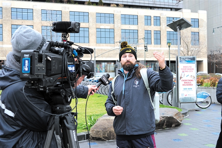 4月10日,在美国纽约,一名现场目击者接受媒体采访。 美国纽约市一架观光直升机10日在曼哈顿岛以西哈德逊河坠毁,机上1名飞行员和5名乘客全部遇难。 新华社发