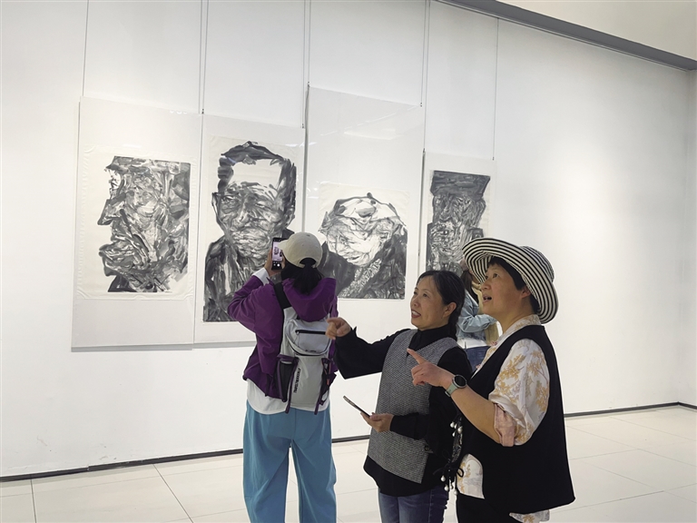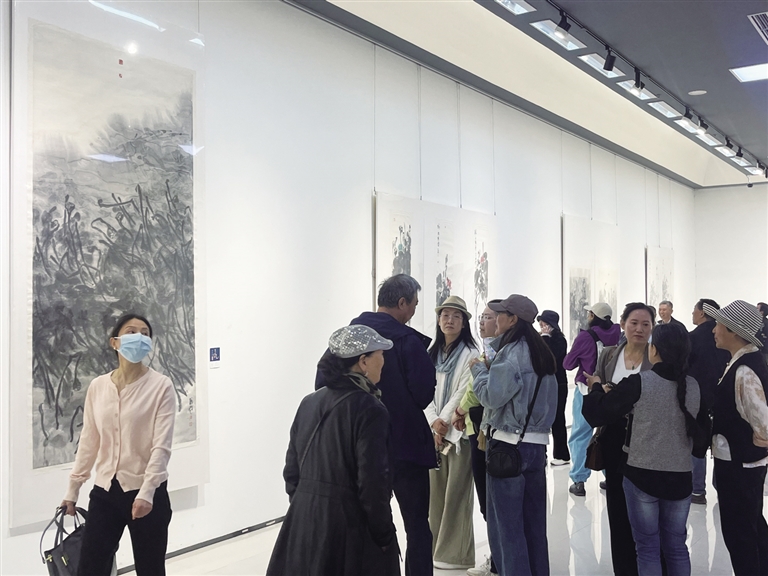 观展现场,人们或驻足细细品味,或低声交流讨论,或与参展艺术家探讨画作的意境。市民刘丽与同伴一同前来参展,在刘发起作品《听雨》前静静欣赏,她对记者说,这是一次文化熏陶的体验,画展的气质和魂魄带给她深深的思考。