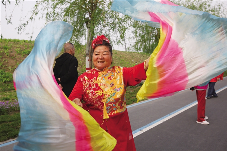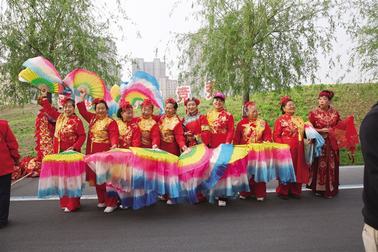 女汉子秧歌队队员挥舞绸扇,为选手们加油。