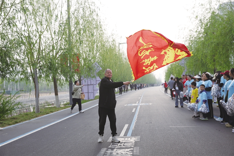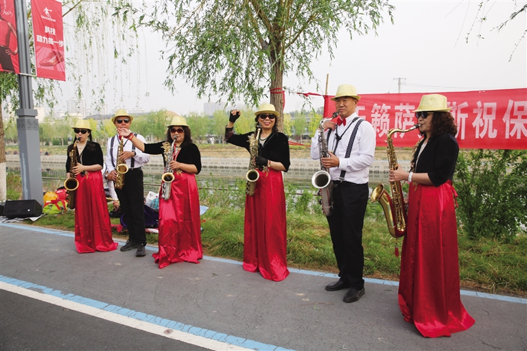复古打扮的天籁萨克斯社团乐手,演奏的《小苹果》与欢呼声完美融合,回荡在春日的空气中,为每一位选手唤醒潜能、注入力量。“我们这个社团成立十年,现在有四五十位成员,基本是六十多岁,年龄最大的79岁。”领队赵青兴奋地说,“这是我们第二次参与保马,去年也来了。今天有十位成员在这里,为运动员加油助威,为保定增光添彩!”