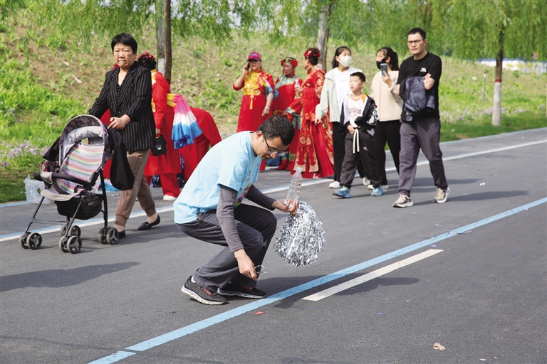 赛事结束后,公园时代社区居民认真地清理地上遗留的垃圾。
