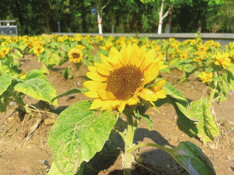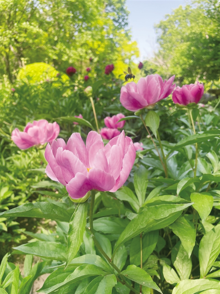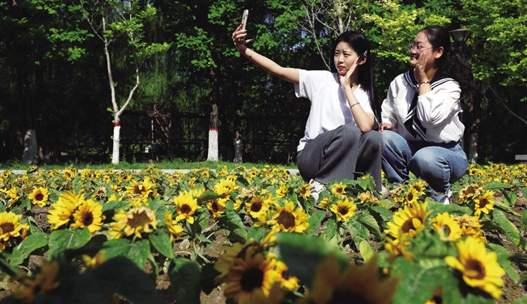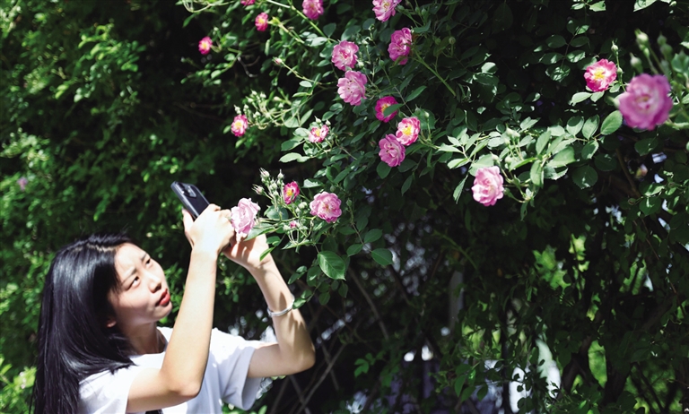 “五一”前夕,市林草生态园宛如打翻的调色盘,处处跃动着明艳的色彩——矮脚向日葵扬起金灿灿的笑脸,在阳光下肆意生长;层层叠叠的蔷薇花粉白相间,如瀑布般倾泻而下;粉色芍药舒展着饱满的花瓣,与酒红色虞美人共同勾勒出一幅流动的莫奈花园。游客们穿梭于花间小径,细嗅着空气中氤氲的清甜花香。此刻尘嚣远去,天地沉醉在这场色彩的盛宴中。