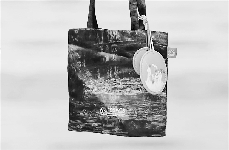 展览上,一款环保袋创意融合了清代象牙雕侍女图案与莫奈画作。袋子上标注的数字和符号显示,这款袋子使用回收材料制作,相当于减排二氧化碳195克。另一款以清代作品《西溪渔隐图》为纹样的托特包用更加直观的图画示意:这只包由9个饮料瓶制成。