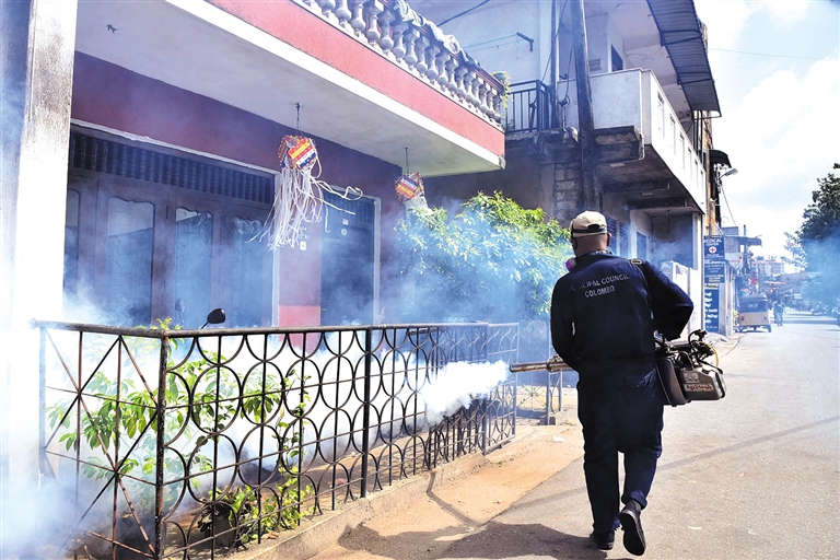 6月6日,在斯里兰卡首都科伦坡,卫生工作者在居民区喷洒消毒剂以预防登革热。 斯里兰卡国家登革热控制中心最新数据显示,斯里兰卡5月份共报告了6042例登革热病例。 新华社发(加扬·萨米拉 摄)