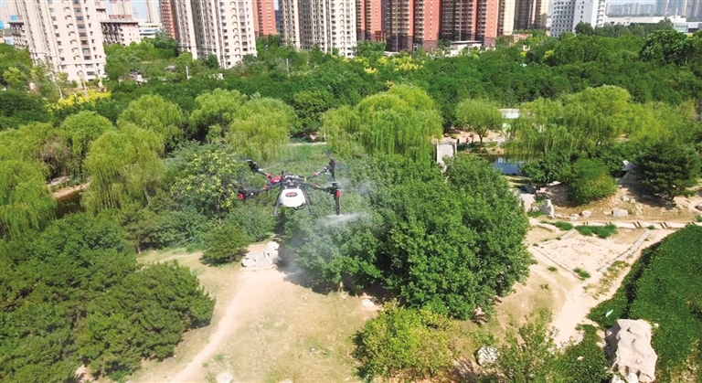 市植物园首次采用极飞P150 Pro无人机开展精准飞防作业。 郝长鸿 摄