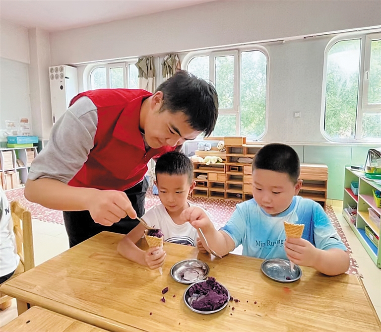 7月23日,竞秀区丽景溪城社区联合辖区领桥幼儿园开展“‘食’光有味 ‘育’见成长”活动。在志愿者带领下,孩子们共同观看营养知识短片,学习膳食搭配技巧,并化身小小厨师,按照步骤制作紫薯泥冰淇淋。当一个个美味冰淇淋作品诞生后,孩子们兴奋地展示和品尝自己的劳动成果,处处洋溢着温馨快乐的气氛。 陈丽佳 摄