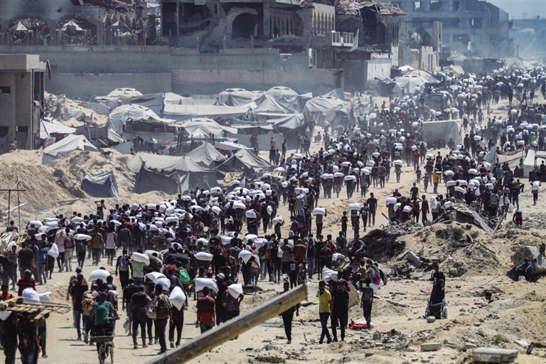 7月27日,在加沙地带北部城镇拜特拉希亚,人们领取通过边境口岸进入加沙的援助物资。
