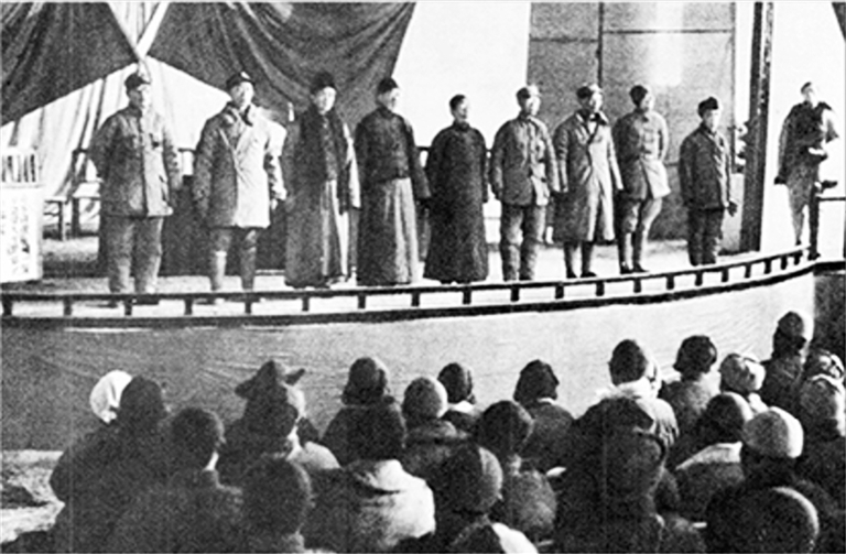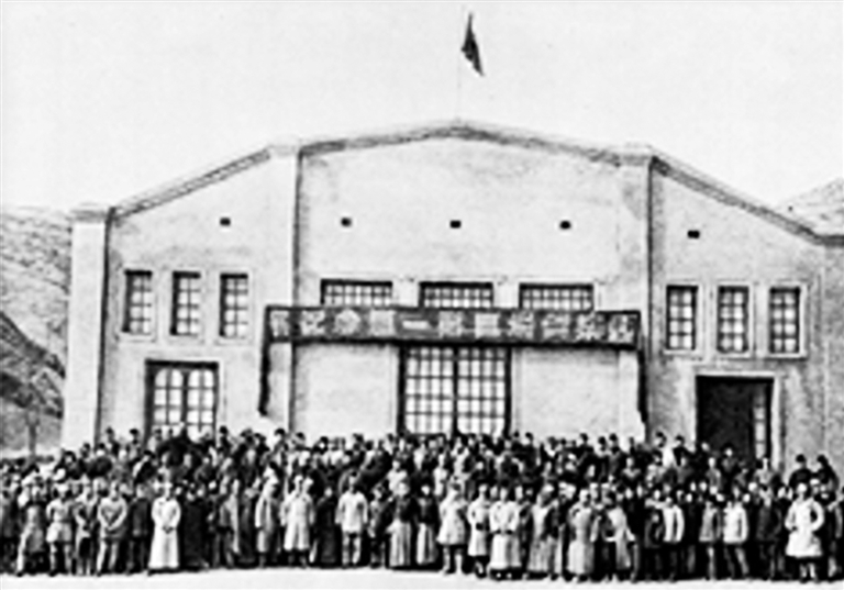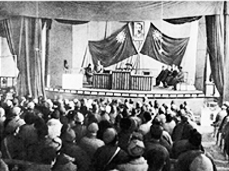1943年1月,晋察冀边区第一届参议会在阜平县温塘村召开,进一步健全了边区一级“三三制”政权的领导机构,使边区民主政治建设进入了一个新阶段。图为晋察冀边区第一届参议会隆重开幕。