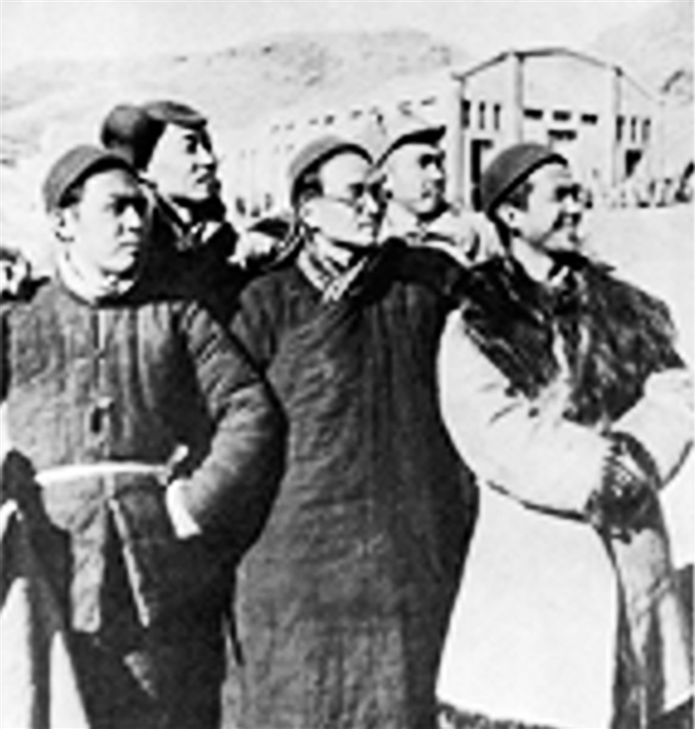 参加晋察冀边区第一届参议会的文艺界参议员。左起:田间、沃渣、沙可夫、沙飞、周巍峙。