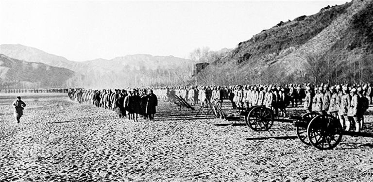 晋察冀边区第一届参议会参议员检阅八路军队伍。