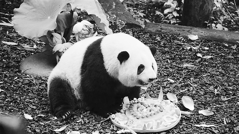7月4日,大熊猫“和花”在它五岁生日这天享用自己的“生日蛋糕” 。 杨寅 摄