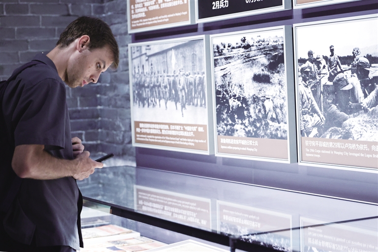 8月27日,一名记者在中国人民抗日战争纪念馆内采访。当日,中国人民抗日战争暨世界反法西斯战争胜利80周年纪念活动新闻中心举行首场外出参观采访活动,组织近200名境内外记者赴中国人民抗日战争纪念馆等地参观采访,观看《为了民族解放与世界和平——纪念中国人民抗日战争暨世界反法西斯战争胜利80周年》主题展览。参加活动的记者来自60多个国家和地区的130余家境内外媒体。 新华社记者 张玉薇 摄