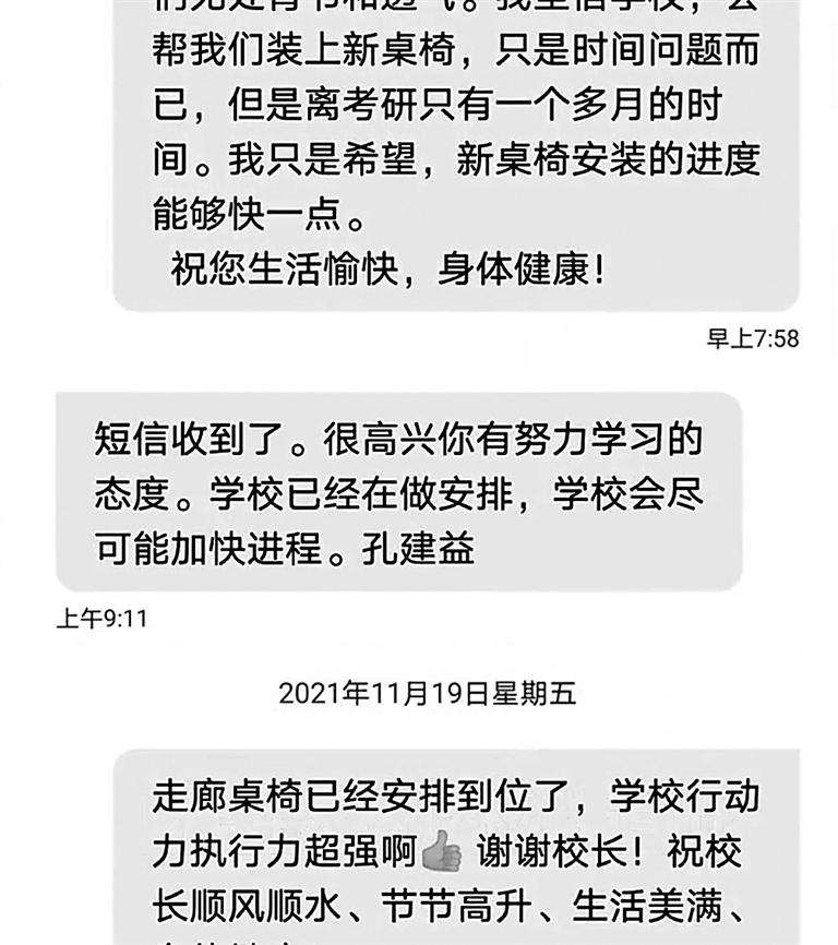 孔建益至今收到了3万多条短信,全部一一回复,学生所反映的合理诉求,他会同各部门一起解决。