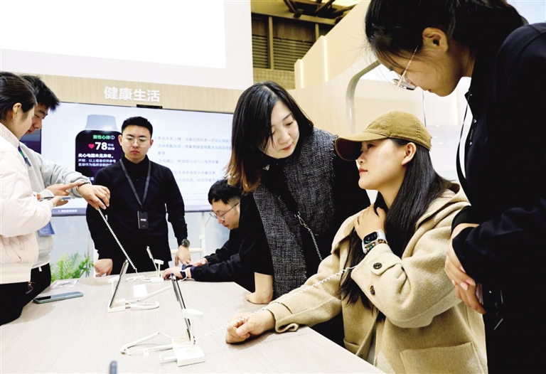 一位参观者(右二)在2025中国家电及消费电子博览会(AWE2025)体验智能手表的腕部动态血压记录仪功能。 新华社记者 方喆 摄