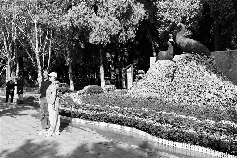 人民广场展区以“月满中秋 菊韵生辉”为立意,设700平方米国庆主题花坛与400平方米菊花区,分为月影菊香、古意菊韵、互动打卡三大板块,搭配20余个菊雕,尽显中秋意蕴与古城雅趣。