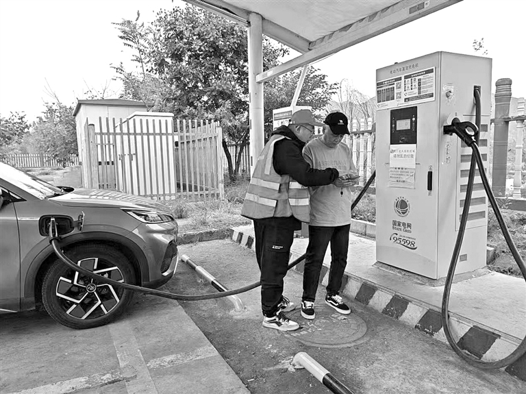 服务保障人员正在协助司机使用充电桩为汽车充电。 张楠 摄