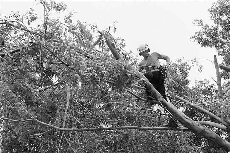 台风来临前,攀树师会提前评估高大树木的状况,适当修剪枝条,防止树木倒伏,保障居民安全。
