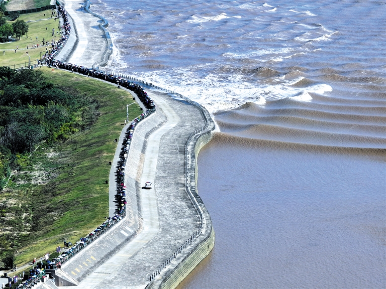 10月10日,游客们在浙江嘉兴海宁丁桥镇的大缺口观潮点观看钱塘江大潮(无人机照片)。