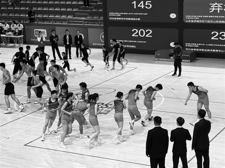 与此同时,3分钟10人长绳“8”字跳项目中,保定市职业技术教育中心一队展现出超强团队协作能力,队员们衔接几乎零失误,绳子甩动的呼呼声与脚步声形成整齐韵律,最终以357次的成绩夺冠。