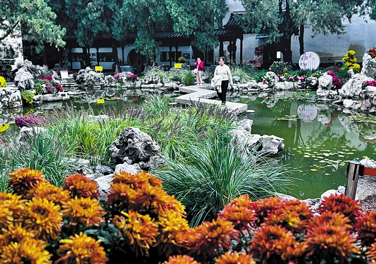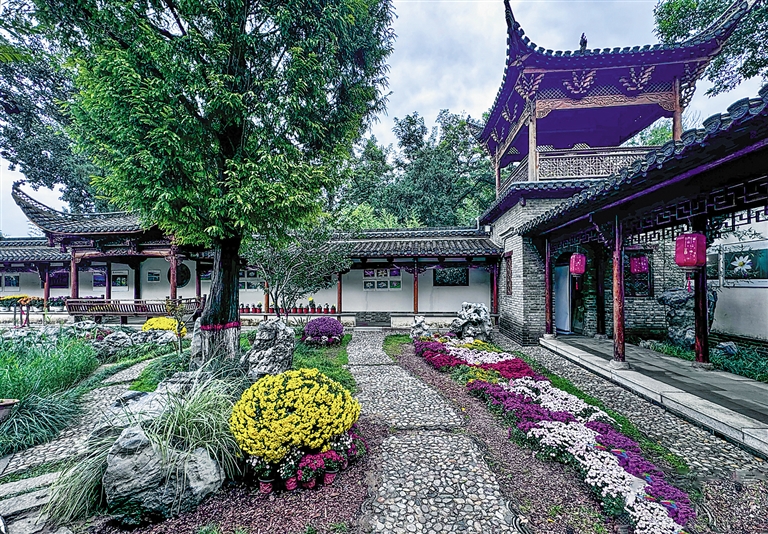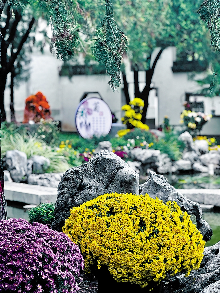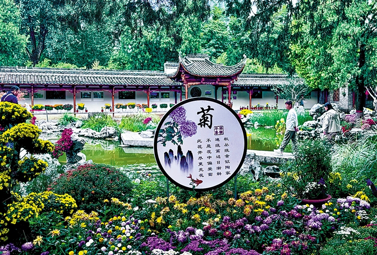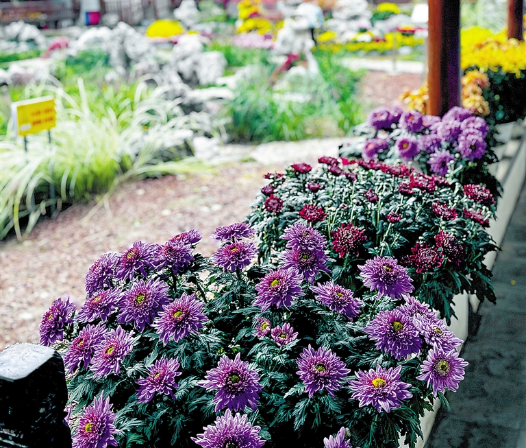⑤亭台楼阁错落,各色菊花沿步道铺陈。