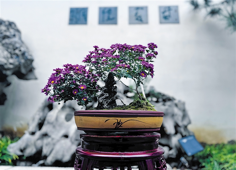 ⑥一盆紫菊盆景于雅致盆器中绽放。