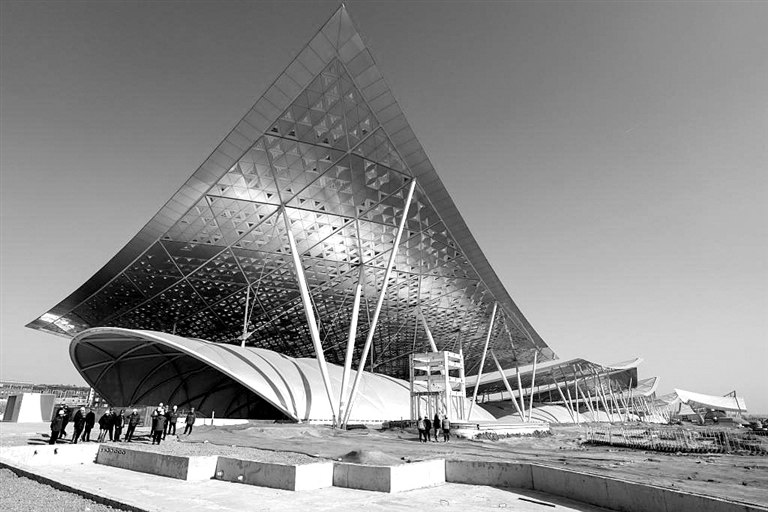2月26日拍摄的北京城市副中心站综合交通枢纽工程和“京帆”屋盖。 新华社记者 鞠焕宗 摄