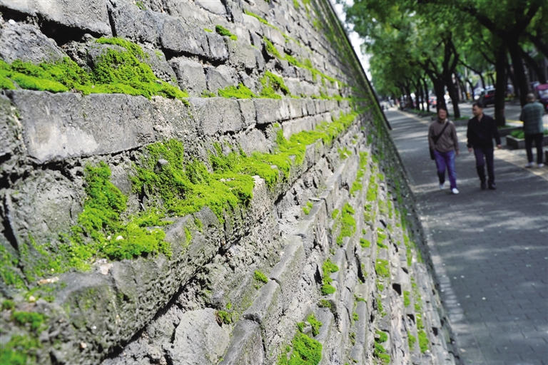 西安城墙北段景色(10月13日摄)。 西安城墙始建于隋唐、扩建于明代,是中国现存历史最悠久、保存最完整的古代城垣建筑。连绵秋雨过后,苔藓等植物为西安城墙披上了一层绿色的外衣,吸引市民和游人驻足观看、拍照。 新华社记者 邵瑞 摄