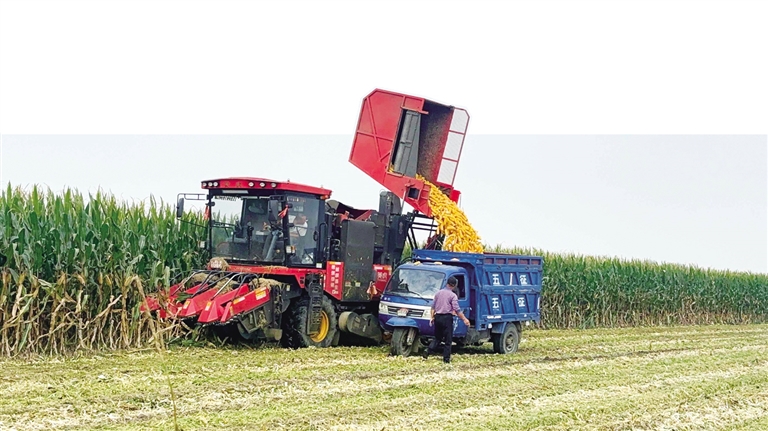 ▲收割机正在收割玉米。 保定晚报见习记者 郭雨航 摄