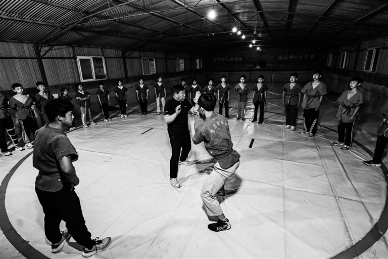 2013年,儿女们都已成家立业,白鹤江决定重拾梦想。他自掏十几万改造了村里的废弃厂房,“直隶国术馆”五个字刷在馆外墙壁上;翻出积灰多年的摔跤服,开始免费教孩子们摔跤。