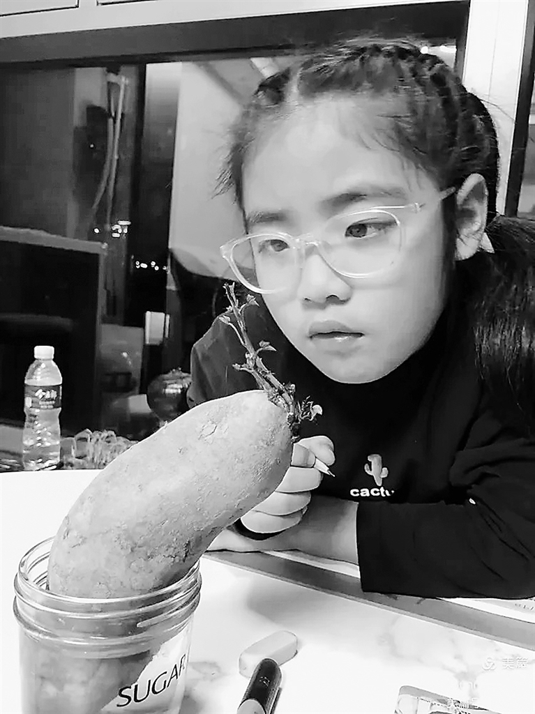 相比之下,孙同学算是及时调整后,顺利通关。她第一次种的洋葱,才三天就长了霉斑,妈妈赶紧建议换掉。换种水培红薯后,孙同学每天按时换水,还不忘搬去阳台晒太阳。没过多久,红薯就冒出了芽,茎和叶越长越茂盛,紫色的嫩叶慢慢变绿。她还会定期用尺子给红薯“量身高”,凑到跟前闻叶片的气味,最终顺利完成了观察记录。