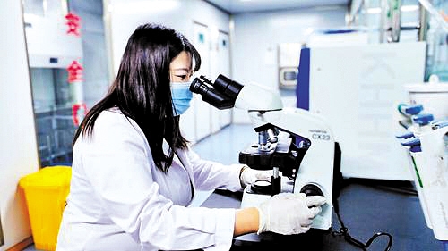 10月15日,在易度河北机器人科技有限公司实验室,检测员使用高倍显微镜观察产品灭菌后的菌落。 贾子轩 摄