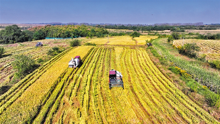10月23日,农机手驾驶农机在安徽省合肥市蜀山区小庙镇石塘村稻田里收割水稻(无人机照片)。10月23日是霜降节气,各地农民在田间地头忙于管护、收获等工作,随处可见他们忙碌的身影。 新华社发(陈三虎 摄)
