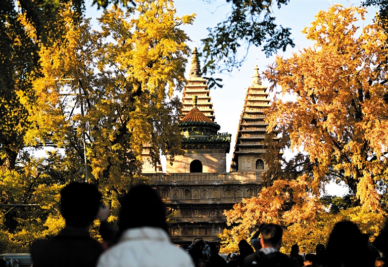 掩映在银杏树下的金刚宝座塔(10月26日摄)。秋冬之交的北京石刻艺术博物馆(也称五塔寺)内,银杏等大面积泛黄,石刻文物掩映在绚烂的色彩中,吸引不少游客前往观赏。 新华社记者 陈钟昊 摄