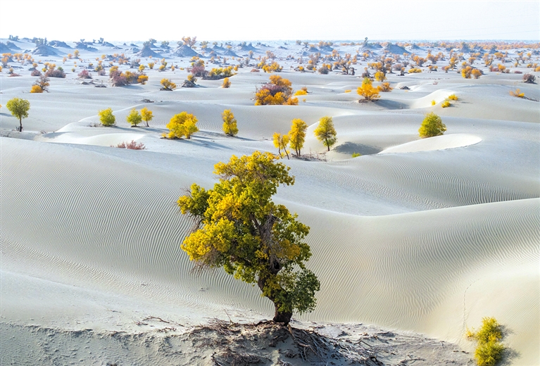 10月23日,在新疆生产建设兵团第一师阿拉尔市的阿拉尔至和田沙漠公路附近拍摄的胡杨林(无人机照片)。金秋时节,新疆生产建设兵团第一师阿拉尔市的胡杨林迎来了最佳观赏季。 新华社记者 才扬 摄