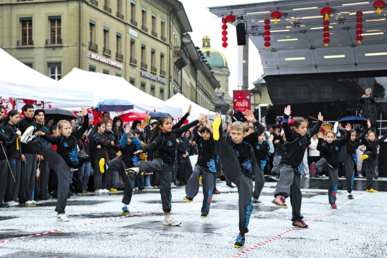10月25日,在瑞士首都伯尔尼,表演者在“遇见中国”文化节上展示中国武术。 为庆祝中国与瑞士建交75周年,“遇见中国”文化节25日在瑞士首都伯尔尼老城举行。当天下午,文化节现场上演中国武术、中国传统舞蹈、川剧变脸、中国民族乐器演奏,以及瑞士传统阿尔卑斯山号演奏等节目。现场还设有香囊及漆扇制作、中国书法、民族服饰展示等近20种文化体验项目,吸引了众多当地民众参与。 新华社记者 连漪 摄