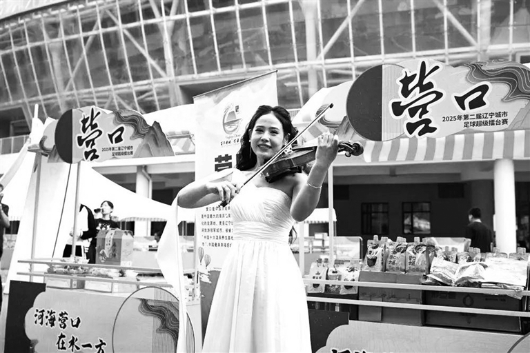 “辽超”场地旁,“辽超市集” 营口摊位进行节目演出。