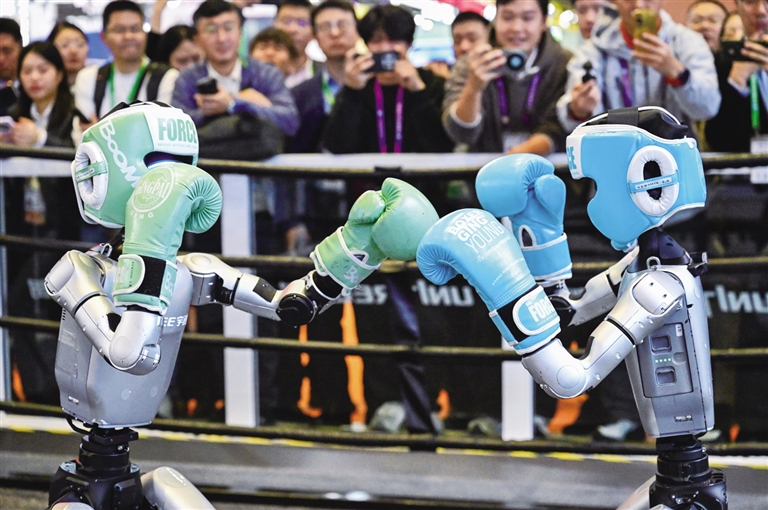 11月6日,在第八届进博会技术装备展区宇树科技展台,两台G1人形机器人的格斗表演吸引了众多观众。它们戴着护具及拳套,施展直拳、勾拳、左右鞭腿,展示倒地自主起身等复杂动作,不时赢得观众喝彩。据介绍,这款亮相表演的人形机器人身高132厘米,体重约35公斤。