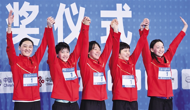 ◀河北队选手马永慧、张可和于子迪(上排从左至右)和队友李冰洁(下)庆祝夺冠。(本文图片均由新华社记者陈益宸摄)