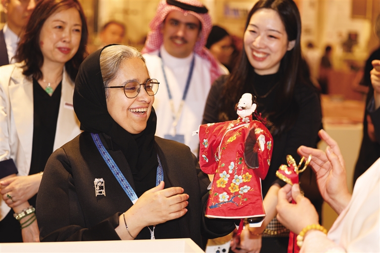 11月13日,在沙特首都利雅得,嘉宾在第三届沙特阿拉伯国际手工艺周中国馆欣赏木偶。