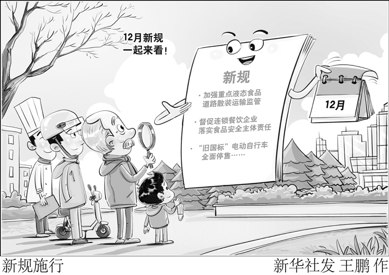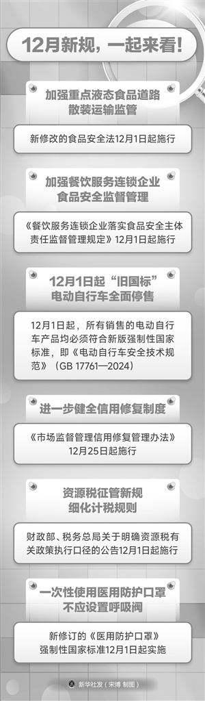 加强重点液态食品道路散装运输监管,守护“舌尖上的安全”;督促连锁餐饮企业落实食品安全主体责任,规范一些连锁餐饮企业“只开店、不管店”问题;“旧国标”电动自行车全面停售……12月新规,一起来看!