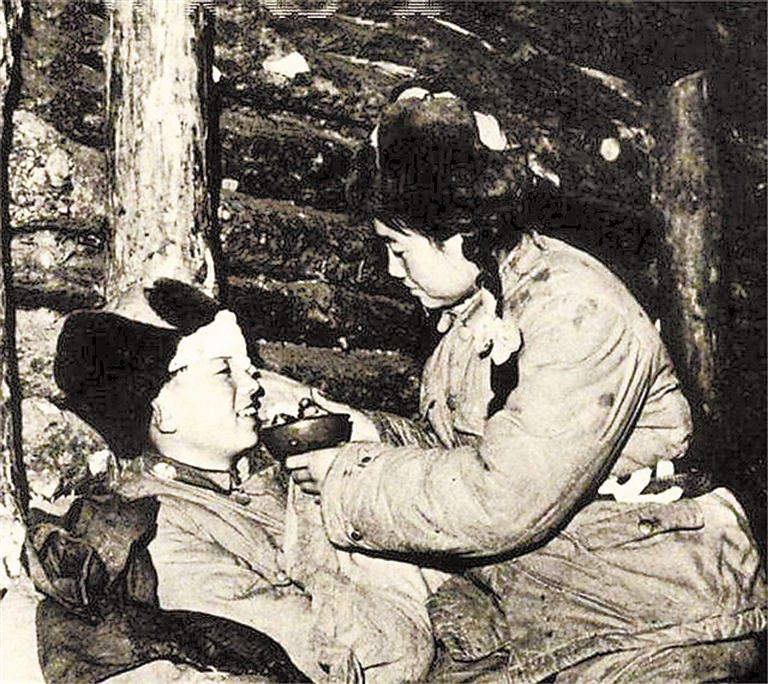 援朝时期志愿军女战士解秀梅在战场救护伤员的老照片。 (资料片)