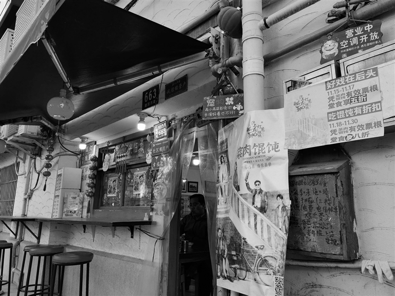 上海市徐汇区一家馄饨店门口张贴的电影海报和凭票根打折信息(2025年11月26日摄)。 新华社记者 陈爱平 摄