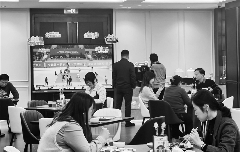 11月20日,游客在广州一家餐厅内用餐,一旁的电视正转播全运会比赛。 新华社记者洪泽华 摄